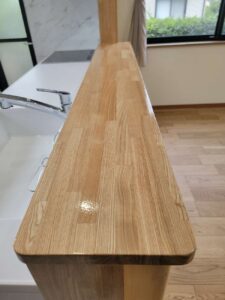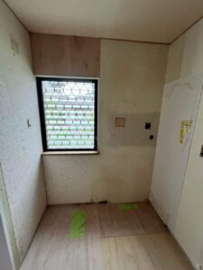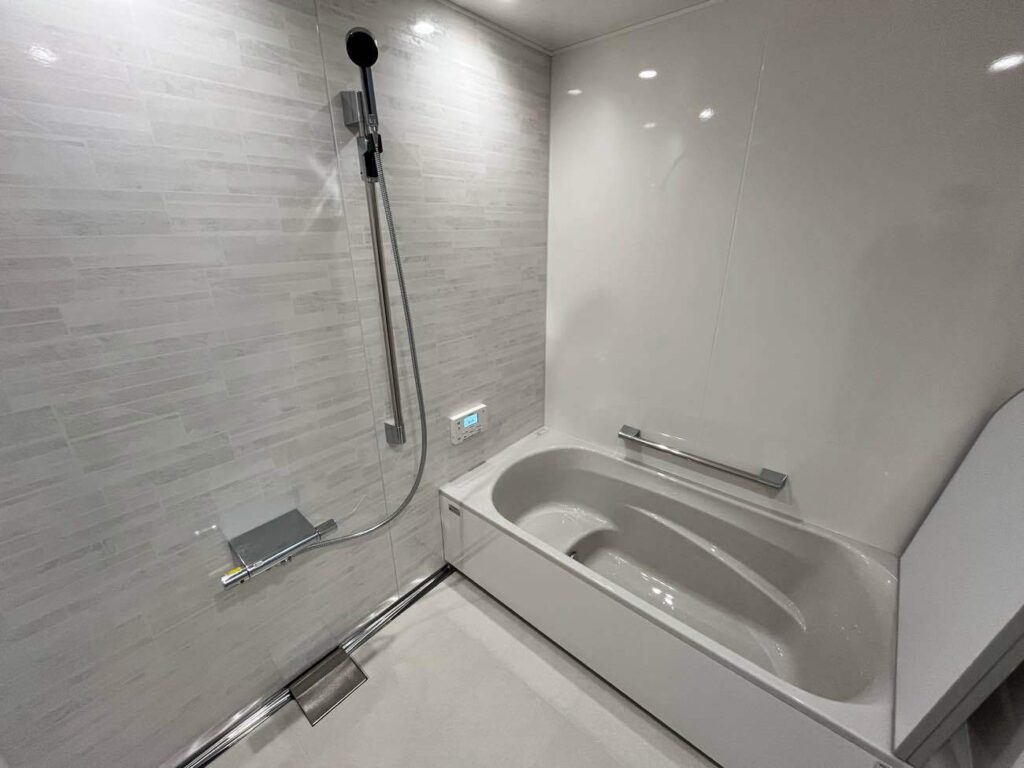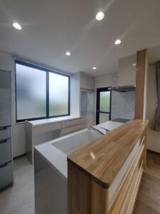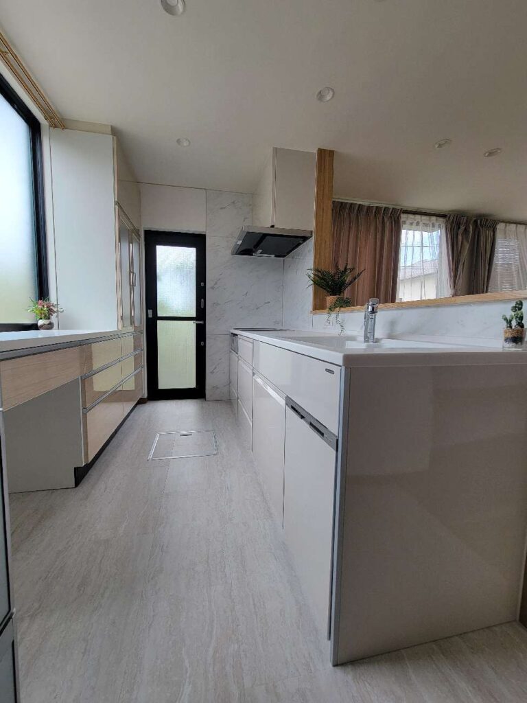 お客様ご希望の白を基調とした水まわりにすることで、清潔感のある空間になりました。人造大理石シンクは、水跡が見えないので掃除がとても楽になり、常にキレイな状態を保てます。浴室入口段差も、リフォームでフラットに解消しました。全体的に白で統一したことで更に開放感あふれる空間へと変わりました。